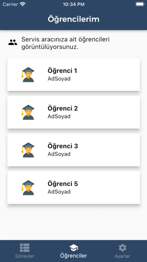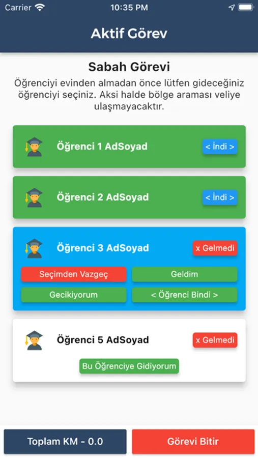 Servisin genel bilgilerini, servisin yolculuk durumunu, öğrenci için planlanan alınış ve bırakılış saatlerini ve yolculuk sürelerini servis yönetimi görüntüleyebilir.