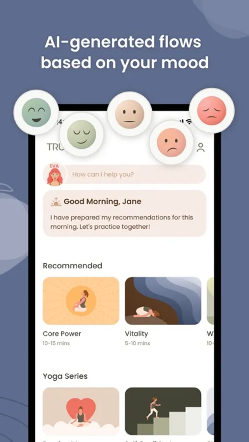 AI assistant EVA, asks your mood and analyzes your body to provide you the flows that will support your natural physical development. In this feature, you will be able to test your flexibility, balance, and strength.