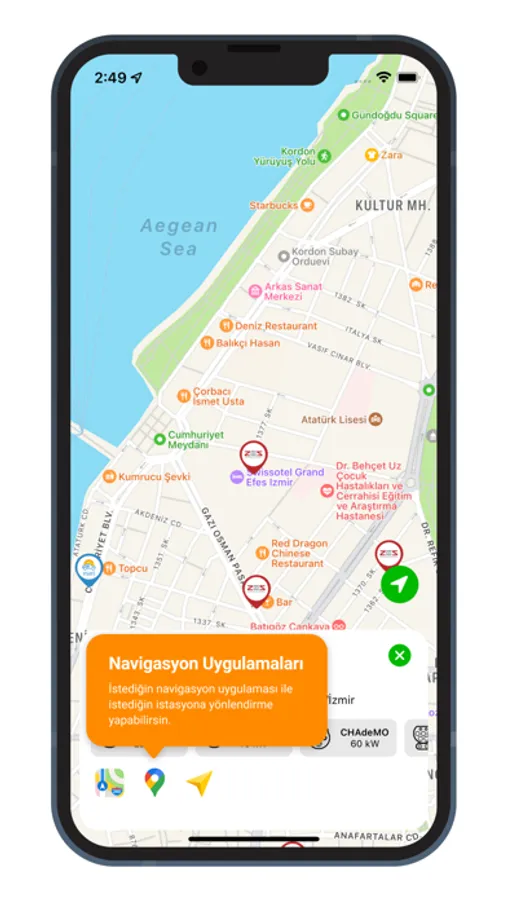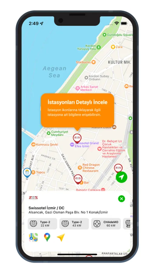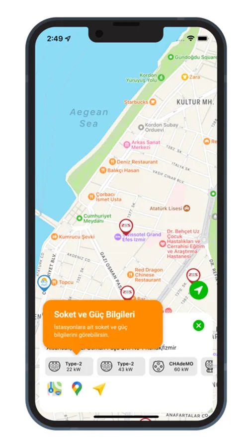 Elektrikli otomobil kullanıcıları için hazırlanan uygulama, kullanıcıların yakınlarındaki istasyonları, bu istasyonların marka, soket seçeneklerini ve güçleri görüntülediği, aynı zamandan Apple, Google ve Yandex Navigasyon yönlendirmeleri ile ilgili konumlara erişmesini sağlamaktadır.