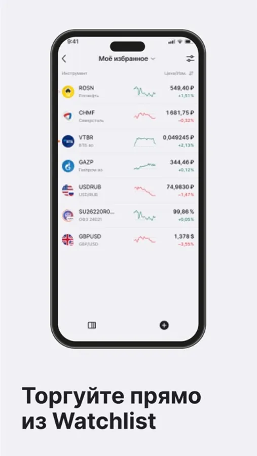 · Опция «Избранное» работает в двух вариантах: первый — список интересующих вас инструментов, сервисов и инвестпродуктов, второй — отслеживание ценных бумаг (Watchlist). Список может включать до 350 позиций.