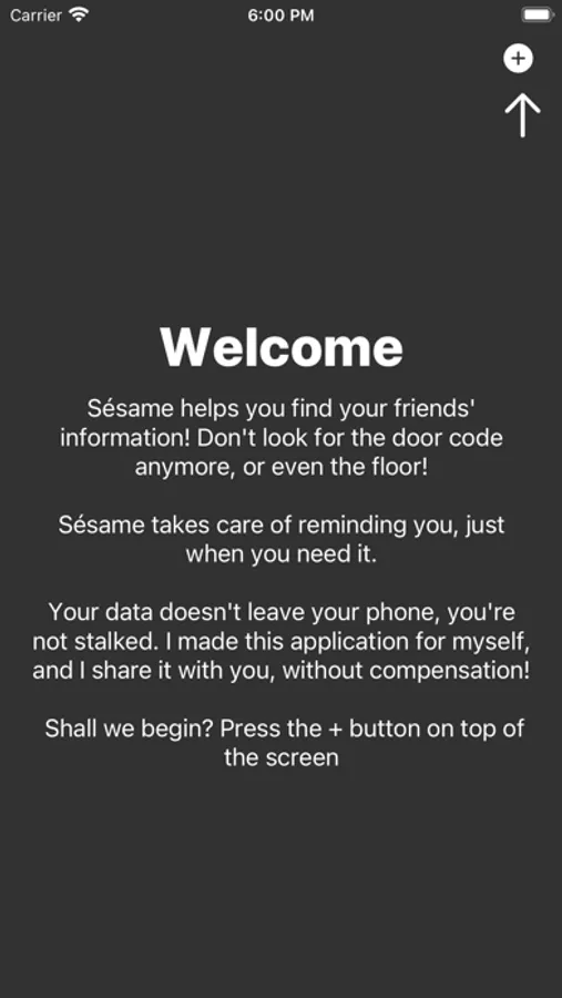 Sésame helps you find your friends' information! Don't look for the door code anymore, or even the floor! Sésame takes care of reminding you, just when you need it. Your data doesn't leave your phone, you're not stalked. I made this application for myself, and I share it with you, without compensation! Shall we begin? Press the + button on top of the screen