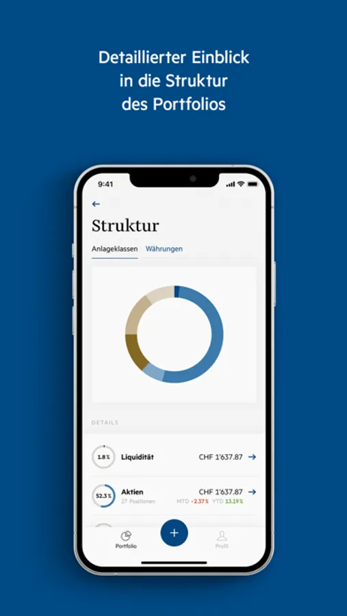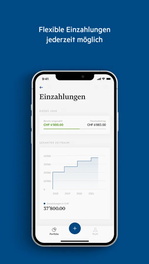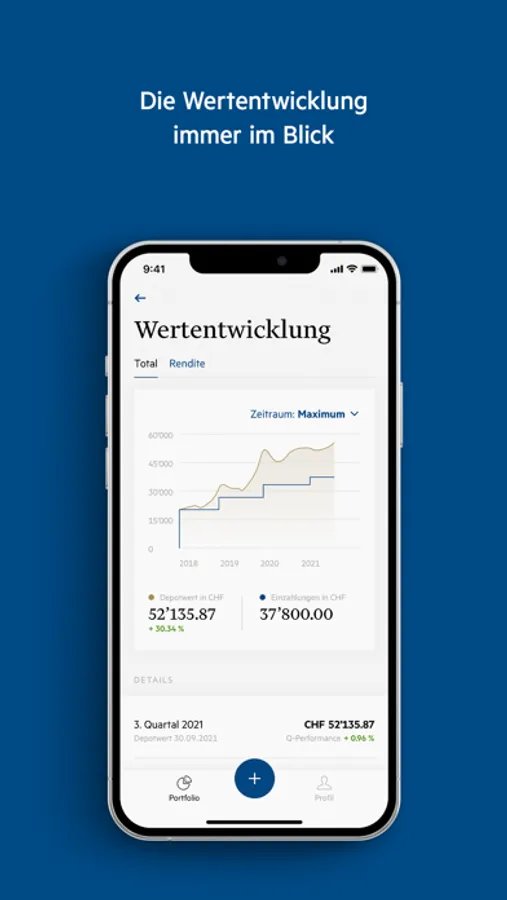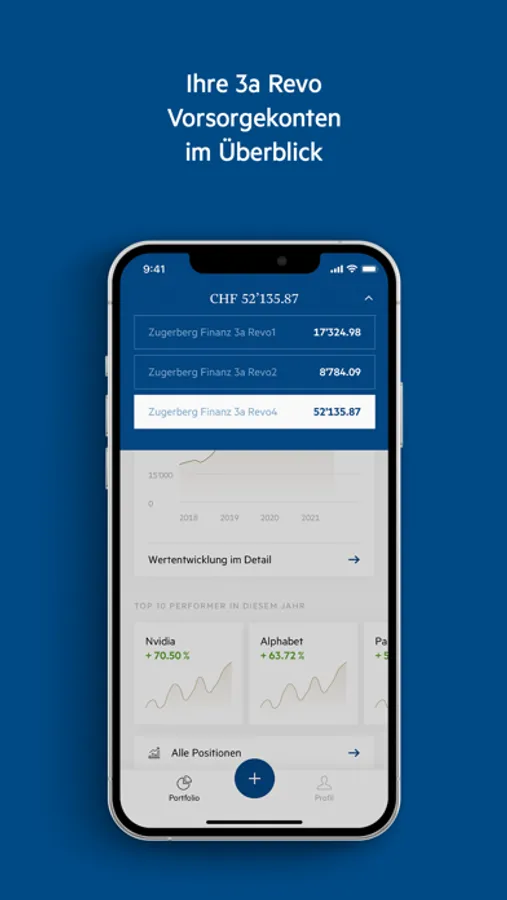 Als Kunde der Zugerberg Finanz haben Sie über die Zugerberg Finanz App die Möglichkeit, jederzeit und überall Ihre Portfolios im Überblick zu behalten. Die App ermöglicht Ihnen dabei einen detaillierten Einblick in die Wertentwicklung und in die Struktur Ihres Portfolios bis hin zu jeder Einzelposition. Sofern Sie über ein 3a Revo Portfolio bei der Zugerberg Finanz AG verfügen, haben Sie ausserdem stets den Überblick über Ihre getätigten Einzahlungen im aktuellen Steuerjahr.