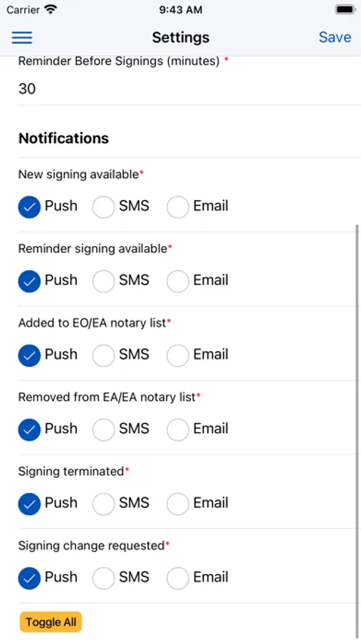 - Send reminders to notaries (push, sms, email)