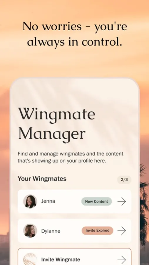 Wingmate is currently invite only. If someone on the app invited you to be their wingmate, welcome to the club.