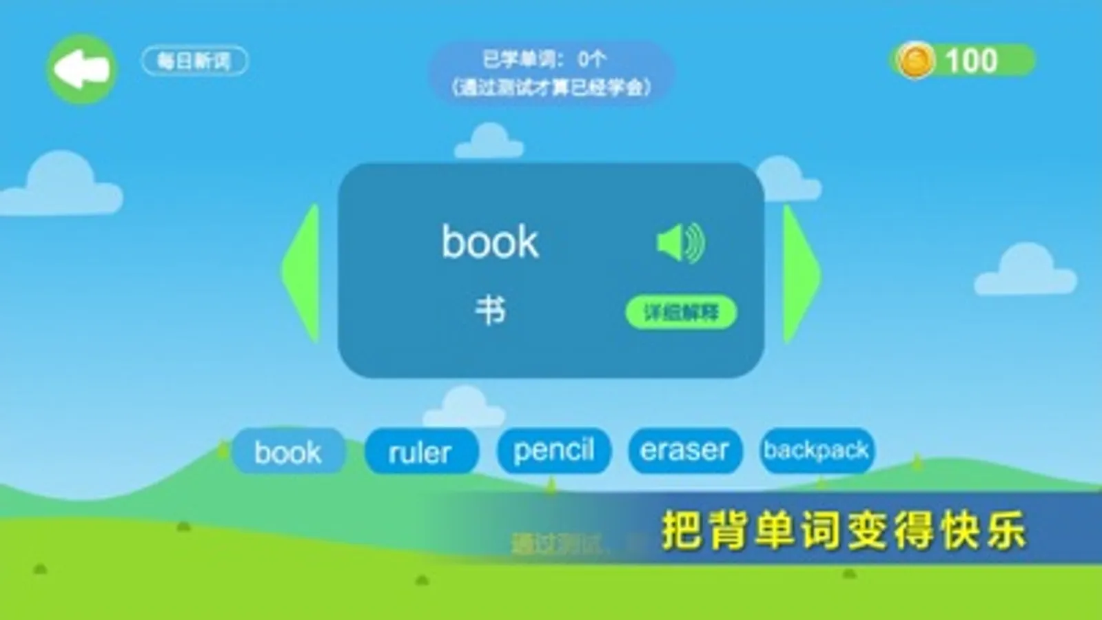 学英语,背单词很重要也很枯燥,特别对于孩子更是如此。即便可以通过大量阅读认识许多词汇,也更多是停留在认识的层面,很难听说读写全面掌握。因此,我们通过游戏来帮助您背单词,让您在开心的游戏中,不知不觉就完成了这个原本枯燥的过程。