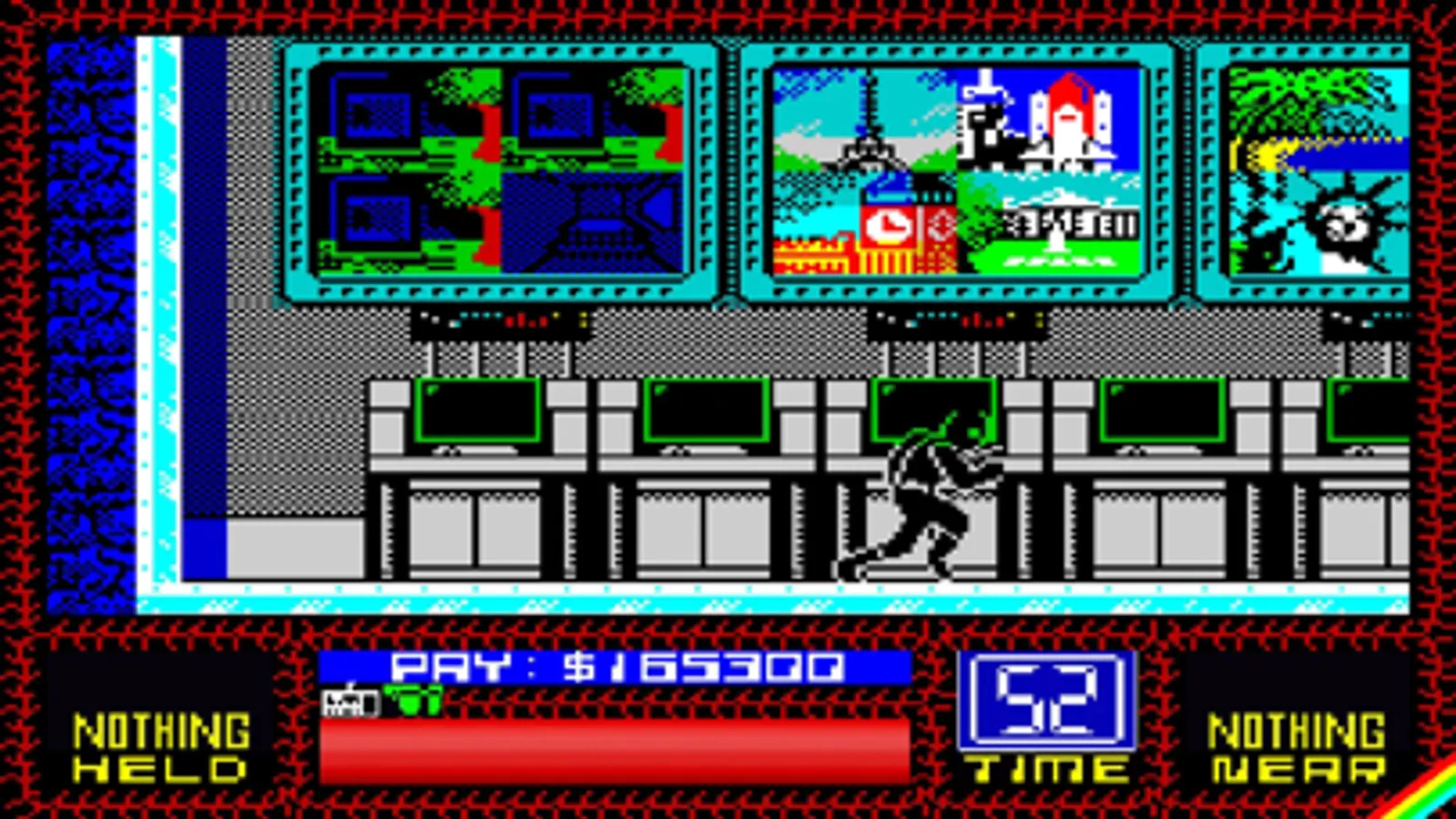 Saboteur! is the classic retro game hit made by Clive Townsend in 1985 for the ZX Spectrum 8-bit computer. In 1985 Saboteur! received the prestigious award "The Crash Smash" from Crash magazine and was high-rated with a 93% score.