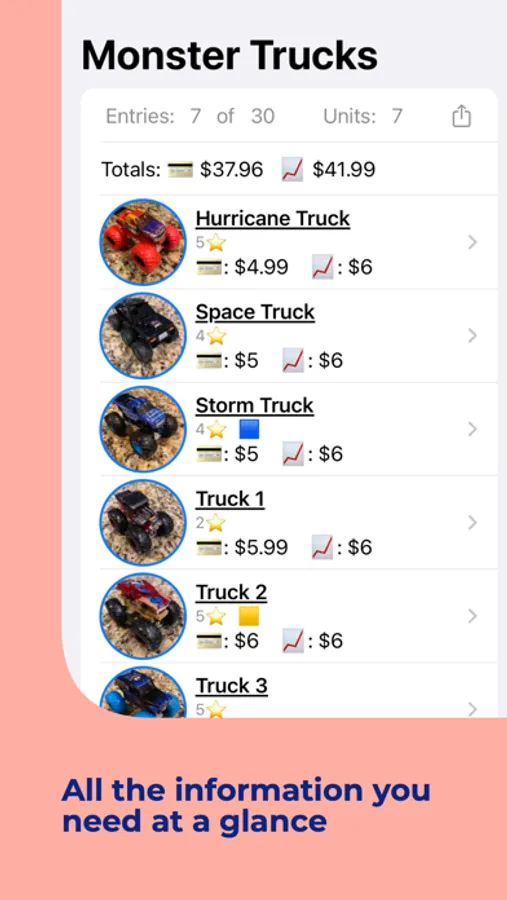 Keep track of your costs and possible sale values. Easily view totals for each category (bin).