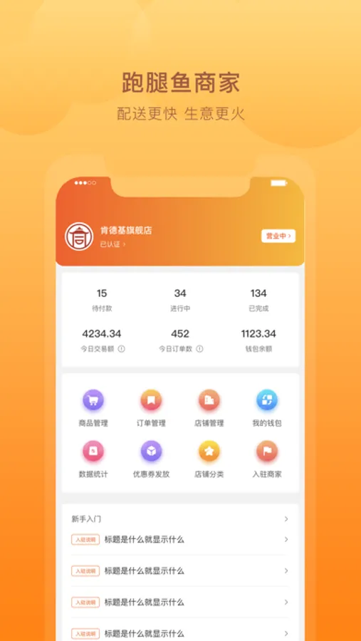 跑腿鱼商家版是入驻跑腿鱼的商家使用的管理软件。主要功能是处理用户订单,上架商品,处理退款,账户在线结算,对账,营销门店,管理跑腿鱼附近商家的店铺,随时调整营业