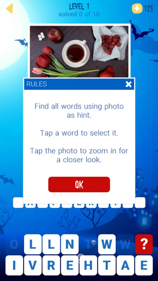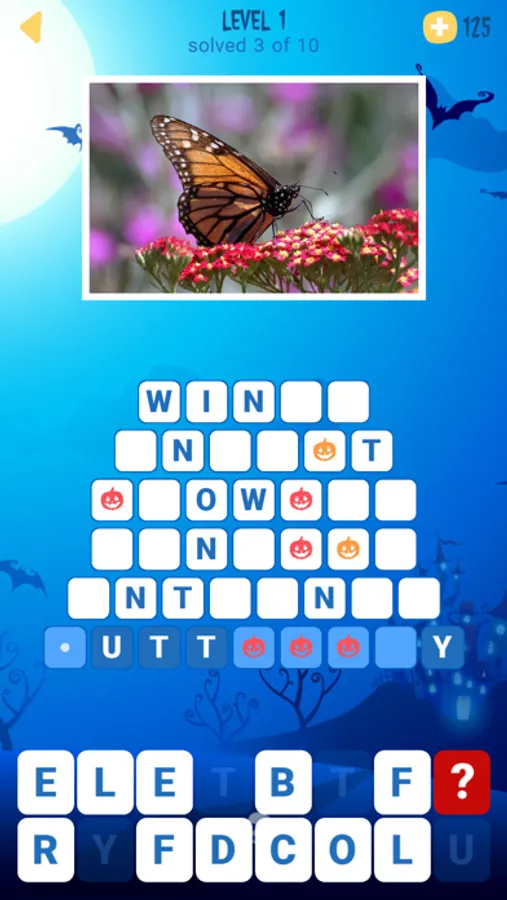 You need to find all the words in the list using the image as a clue. Tap the word and use some of the given letters to decipher the word. Also, some words have bonus tiles that will help you reveal letters in the other words of the puzzle. When all the words are found, the next level will be unlocked for more fun! Have fun this Halloween and try to find all the words while looking at amazing pictures!