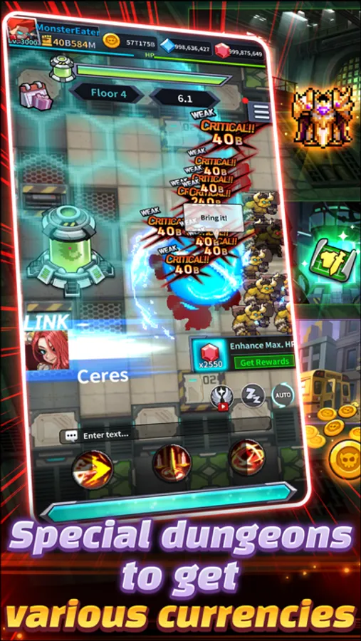 You can easily obtain gold, EXP, equipment, and materials for upgrades!