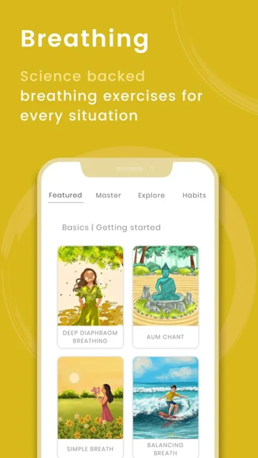 Get started with simple deep breathing, accompanied visualizations will help you get used to the basics.