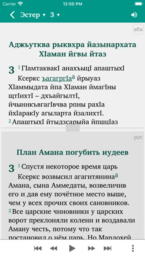 The app includes dictionary links to the key terms and a short glossary of key terms. Also includes audio for Abaza texts (an Internet connection is needed for streaming listening or for the first download of each audio file to the smartphone's internal memory, with subsequent offline listening).