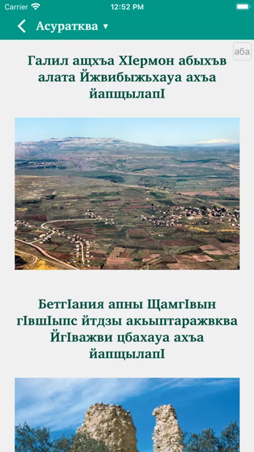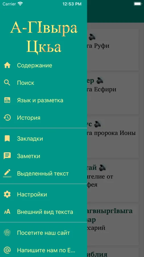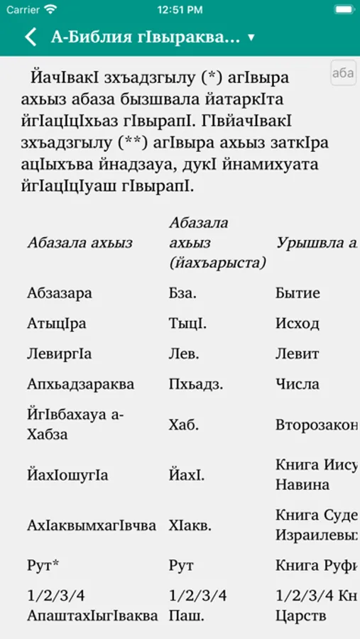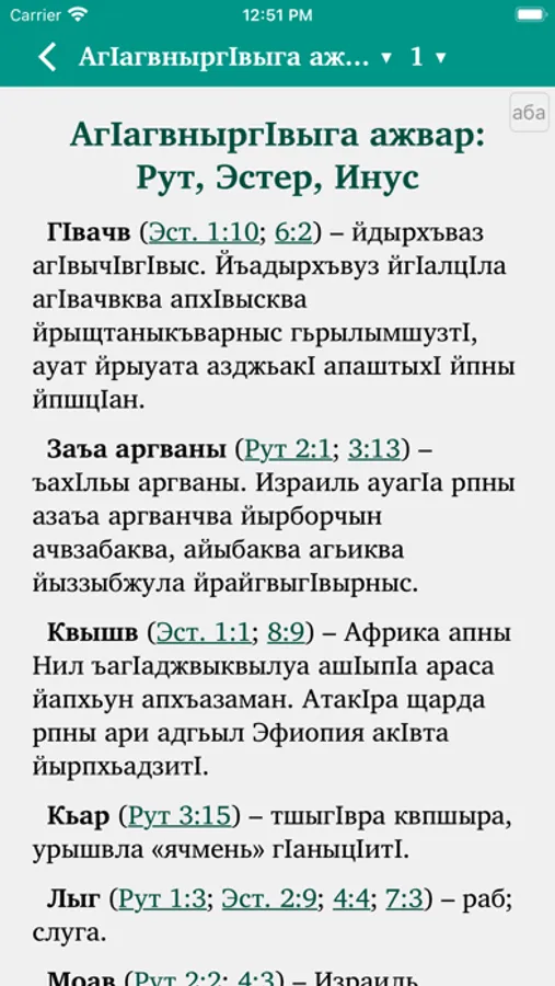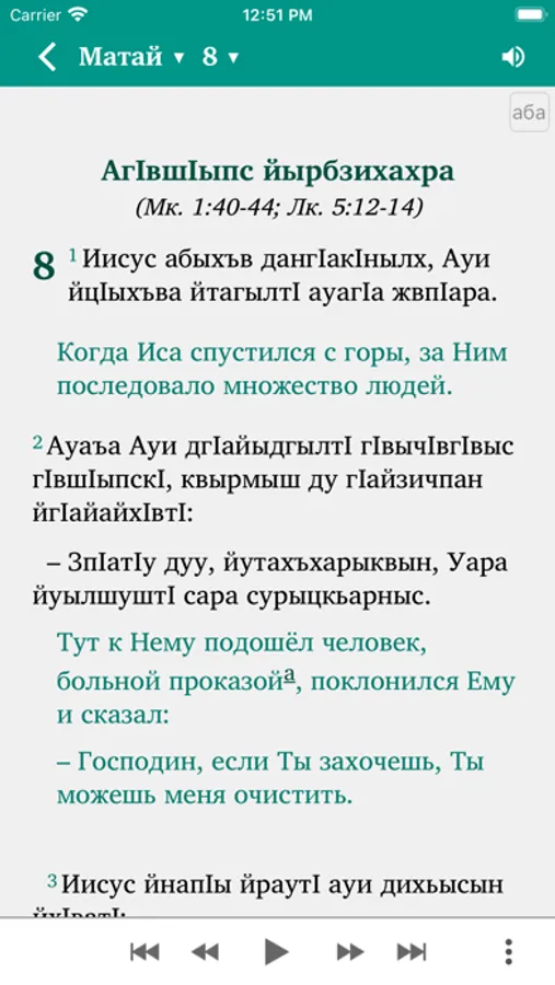 This Scripture app facilitates Bible study in the Abaza language. The Russian translation (NRT) can optionally be added in parallel to the Abaza text. Users can highlight verses in different colors, make bookmarks, write notes and view their reading history.