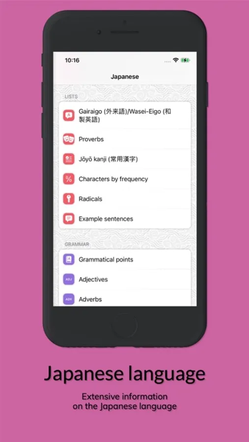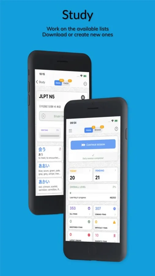 • Study the lists already available or create your own lists of kanjis and words. Just enter you words in Japanese and the app will translate them. You can even download commonly used Japanese textbooks words lists.