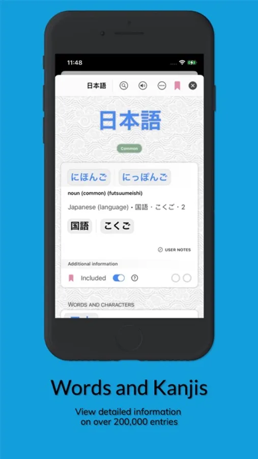 • Search any word or kanji, from Japanese, romaji, or English.