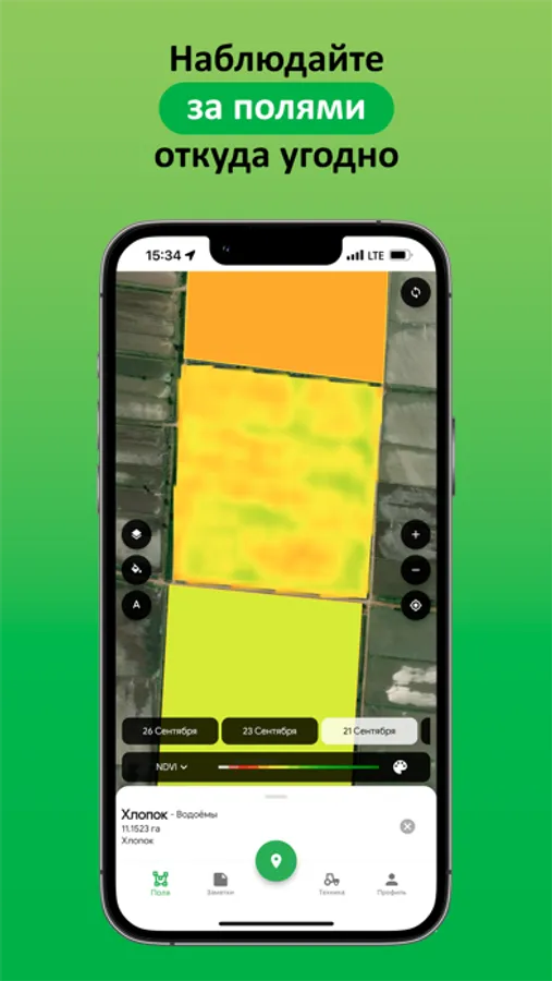 Выделите свои поля на карте — мы обработаем спутниковые снимки и покажем, как развиваются посевы. С помощью спутниковых снимков мы рассчитываем индекс вегетации (NDVI, EVI и другие) — показатель состояния растений.