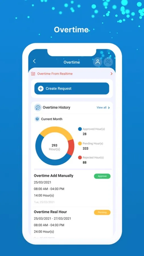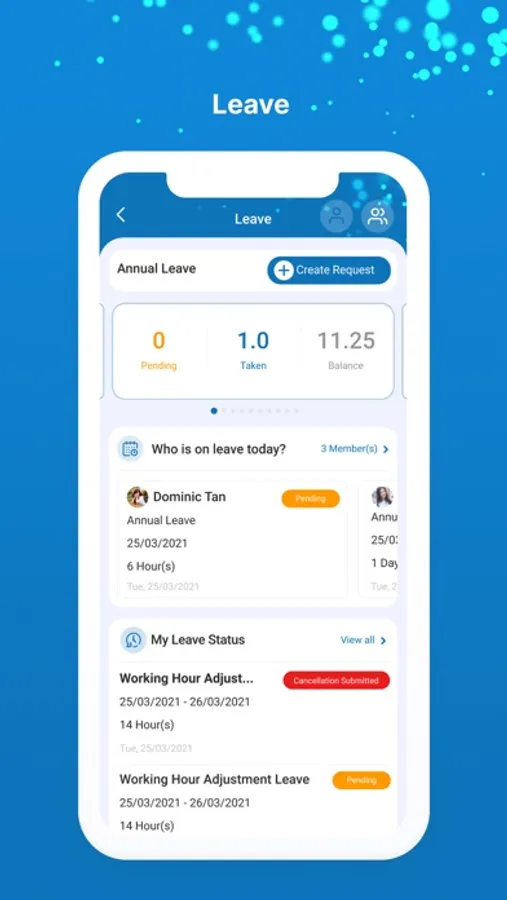 - Employees can request leave, overtime, real-time, personal information & contact change , and expense claim. They can also cancel these requests of themselves