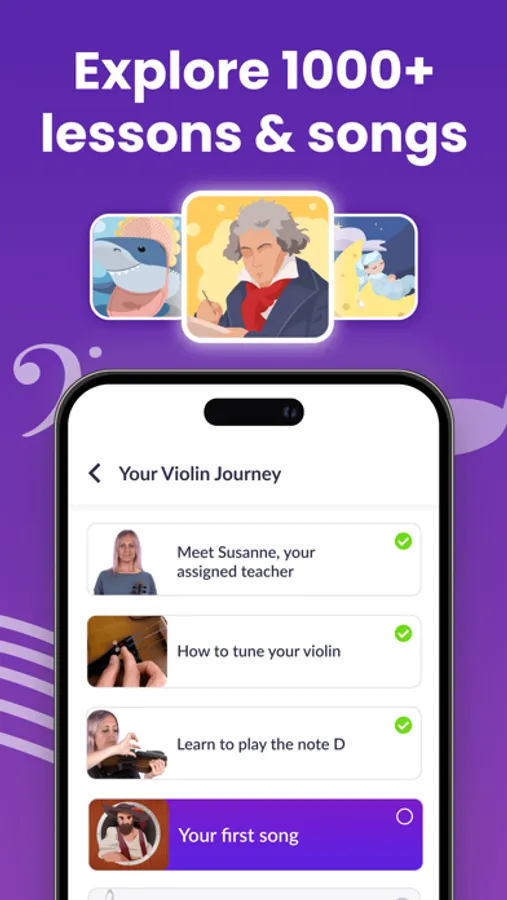 We’ve created short lessons and exercises matching your pace of learning. All violin lessons are tailored by music teachers and include: