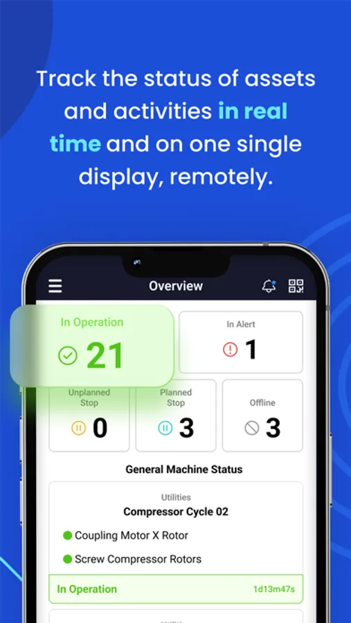 You no longer need to go to the machine to collect the data - the information is sent in real time directly to the app. You can monitor everything remotely, avoiding risks and empowering your maintenance team.