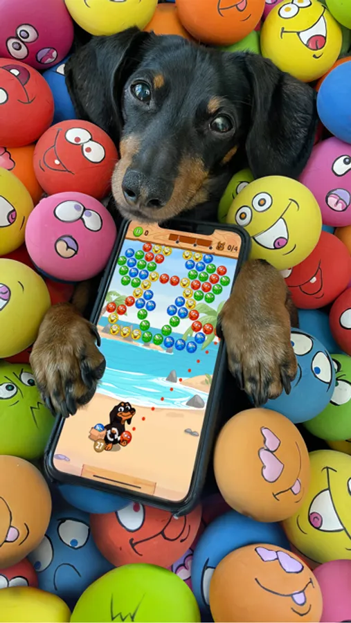 Introducing Crusoe Squeaky Ball Bubble POP - Crusoe the Dachshund's new bubble pop game. With fun balloon shooter, plenty of puppy friends & squirrels, ball burst gameplay, and funny squeaky toy sounds your dog might love it just as much as you!