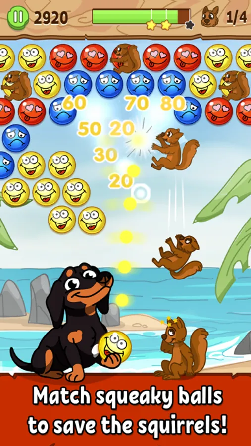 Important: In the Crusoe Dachshund dog bubble shooter, instead of popping bubbles, you pop squeaky balls to save the squirrels!