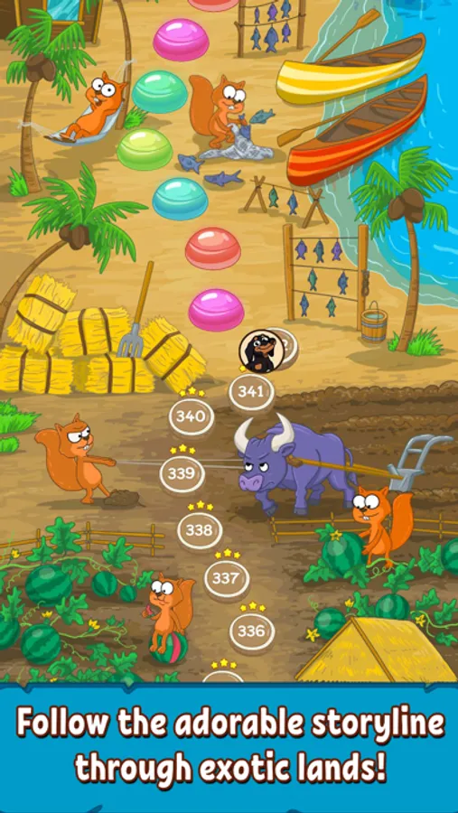 Now it’s up to you to journey across exotic lands by overcoming fun but challenging levels. You’ll have to carefully aim, match 3, shoot, and pop squeaky balls - and they definitely squeak with each pop! Keep your sound on to watch your dog’s funny reaction!
