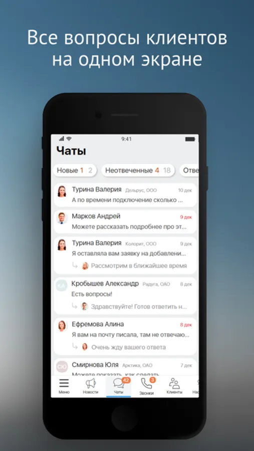 • Push-уведомления — оповещения о новых запросах и сообщениях.