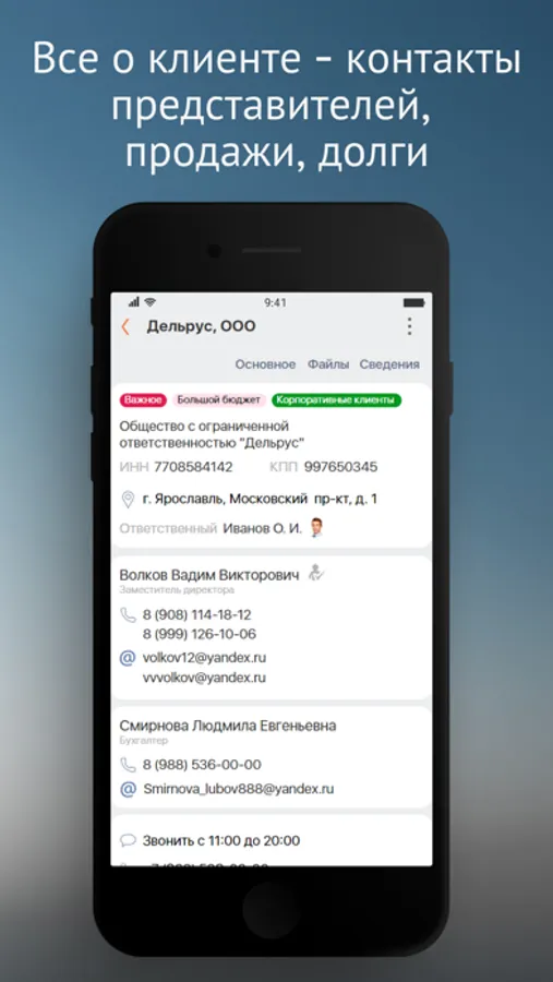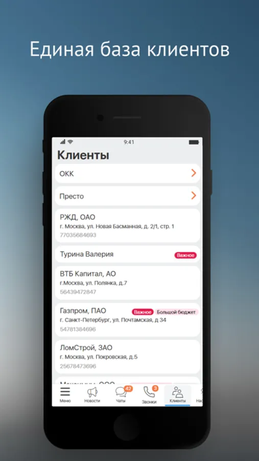 • Единая база клиентов — раздел с контактами представителей, суммой продаж и долгами клиентов.