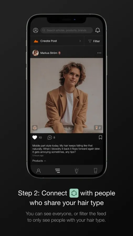 It begins with a hair type quiz. Once you take the quiz you will enter the hair community where you can filter your social feed based on your hair type.