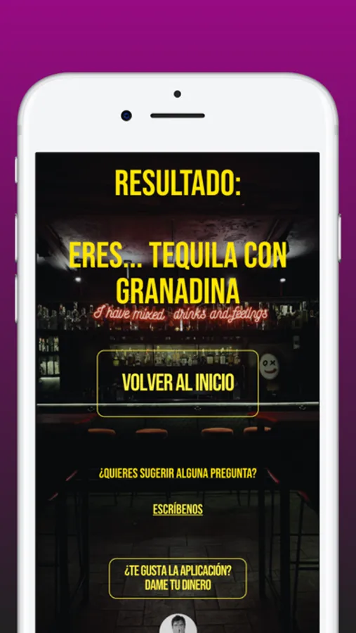 Esta app te hará 4 preguntas aleatorias. Dependiendo de tus respuestas, te sugerirá un chupito.