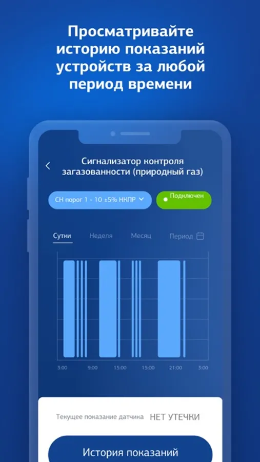 В любой точке мира Вы будете осведомлены об уровне загазованности (при возникновении аварийной ситуации направляется Push-уведомление в приложение либо письмо на электронную почту). Также Вы можете посмотреть статистику показаний за интересующий Вас период времен