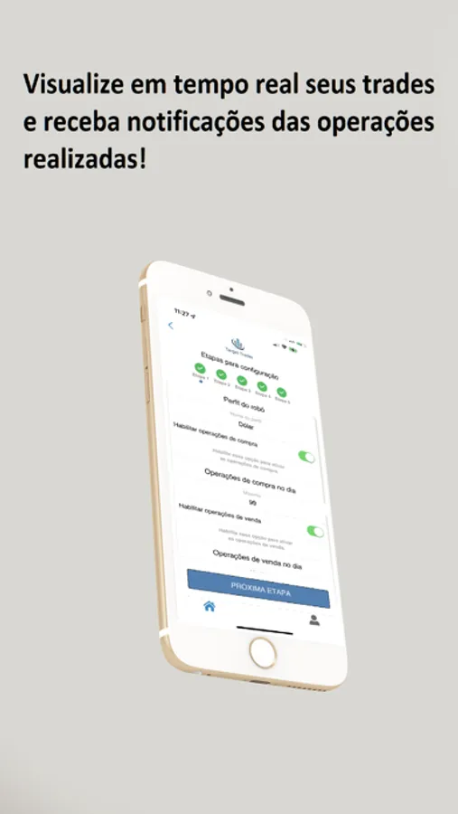 • Visualize em tempo real seus trades e receba notificações das operações realizadas.