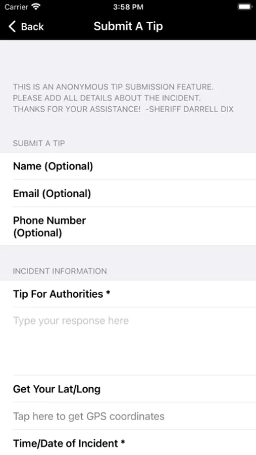This app is not intended to be used to report emergency situations. Please call 911 in an emergency.