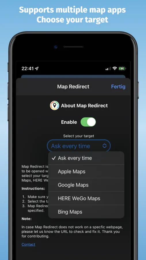 6. In the Map Redirect popup, you can select your target. For example: select Apple Maps