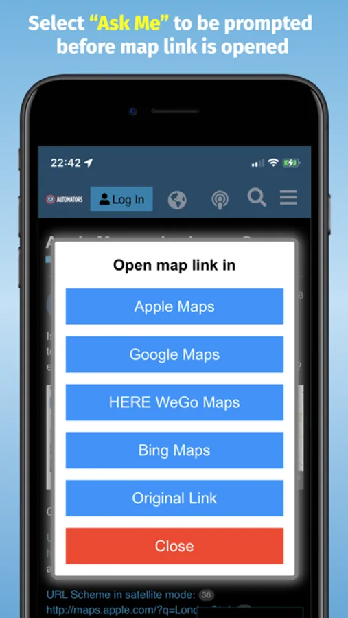 Map Redirect will automatically redirect you to the maps app of your choice. If you select "Ask Me" a prompt will appear to ask you where to open the link.