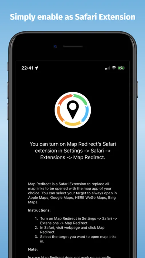 2. Go to Settings → Safari → Extensions. Enable Map Redirect as Safari Extension