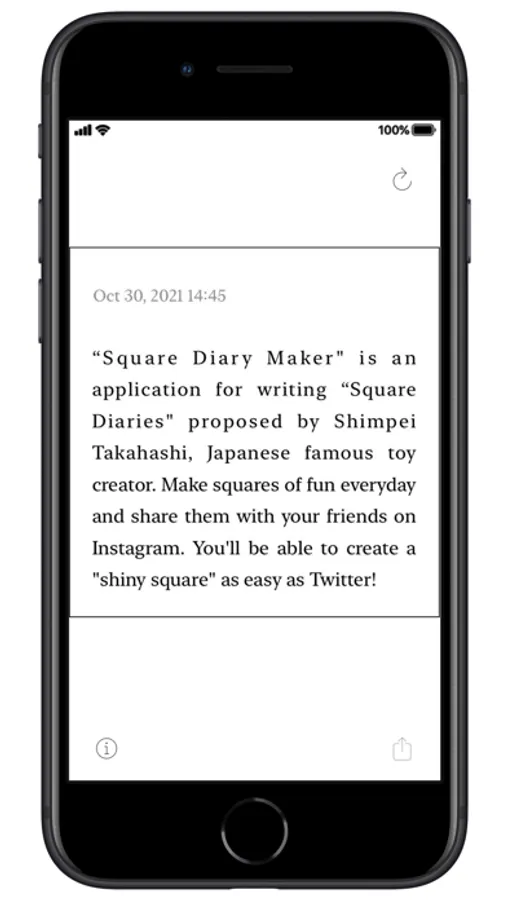 This is a dedicated application for writing a "square diary" advocated by Shimpei Takahashi, Japanese famous toy creator. Make a square of the fun things that happened today and tell your friends about it on social media.