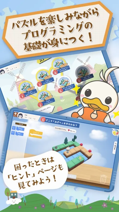 ブロックプログラミングの方法や使い方を楽しく遊びながら学ぶ『コースでまなぶ』では、3Dのゲーム画面であひるクンを操作し、ブロックコマンドを駆使してダイヤをゲットし、ゴールを目指そう!