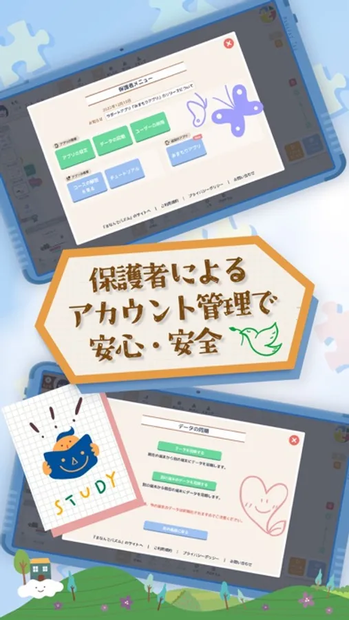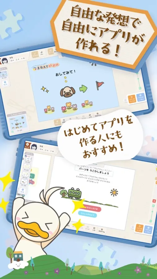 キャラクターを動かしながらお絵描き紙芝居ツールとして、デザインを学びながら遊んでもいいし、頑張って本格的なアプリを作ってみる事もできるよ。