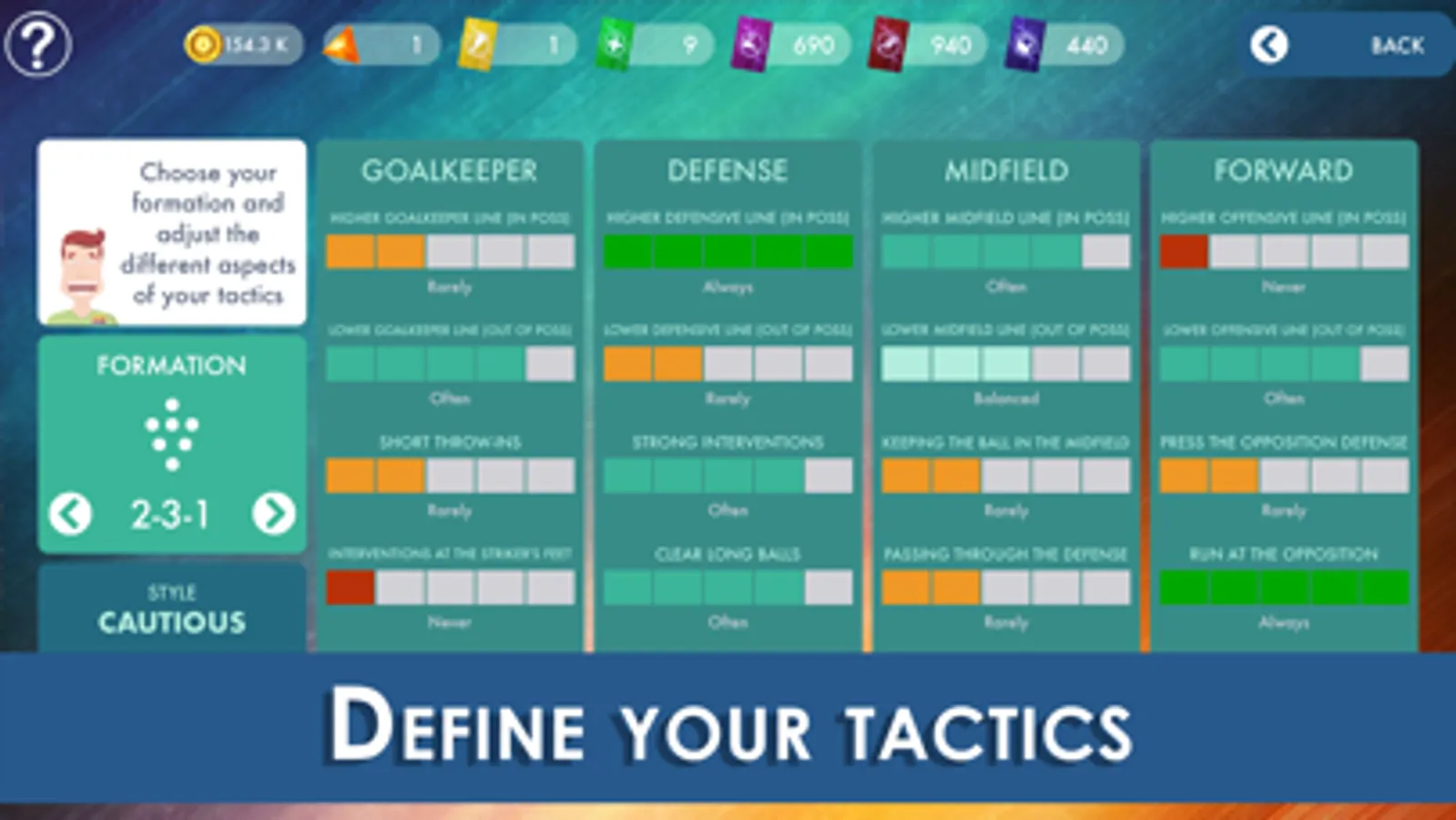 Choose your formation and define your strategy by adjusting 20 tactical aspects at any one time.