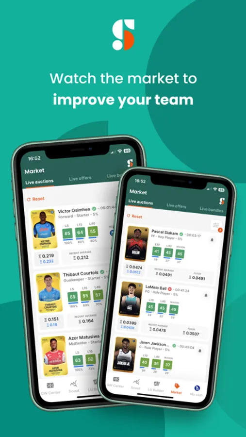 - Live auctions, offers and bundle tabs with detailed information including each player’s L5/L15/L40 averages, their playing time during each span, fixture in the next gameweek, recent sales prices, floor price on the secondary market, current high bid and next bid price;