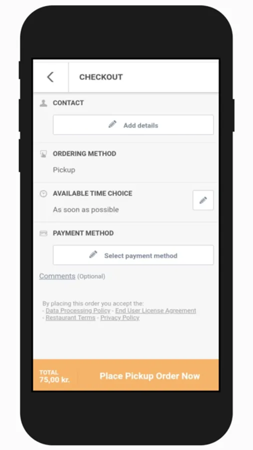 Du kan vælge mellem at betale kontant, alle betalingskort, eller Mobile Pay når du afhenter din mad.