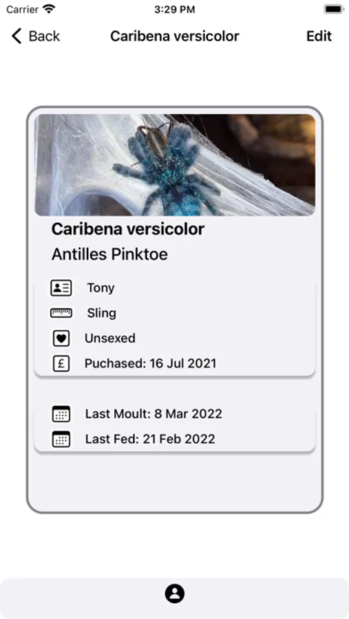 - Quickly edit tarantula profiles when they feed and moult to ensure you stay up to date with everything your tarantulas are doing