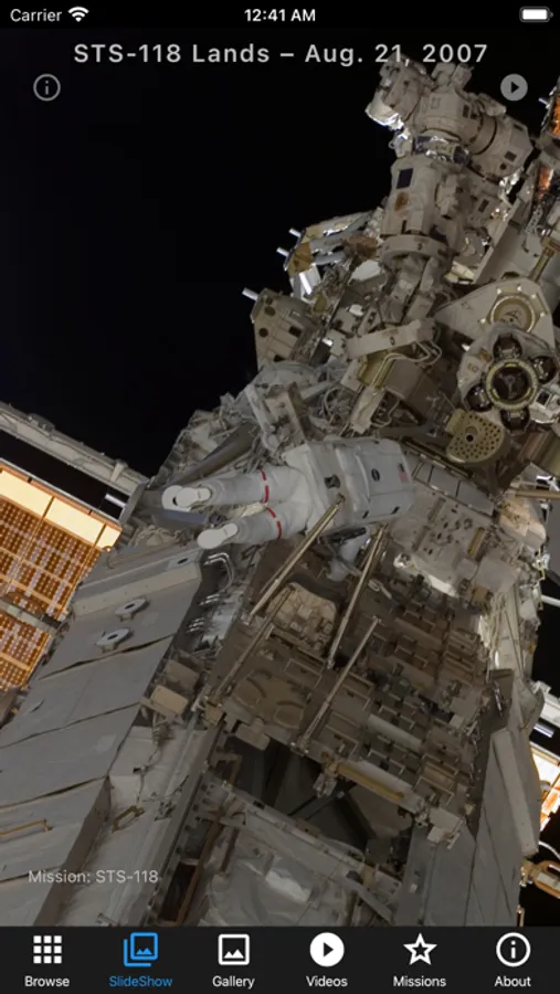 • In the "SlideShow" section, you will be able to browse through hundreds of impressive photos in full-screen size and feel as if you were in the Earth's orbit at that moment. If you wish, you will be able to get detailed information about these impressive sights by tapping the Info button. Additionally, you can start auto-play by tapped the Play button on the top right.
