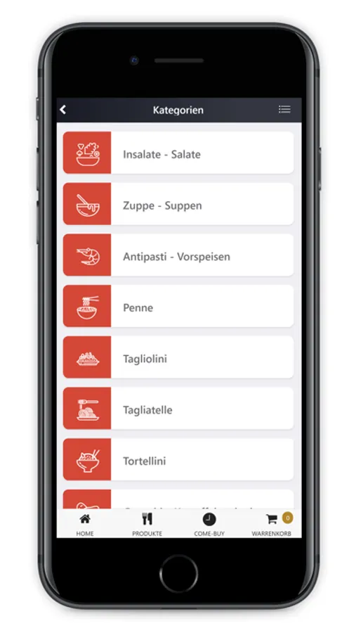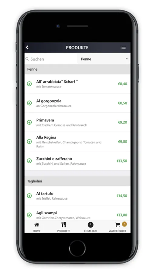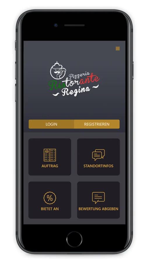 Mit der mobilen App Pizzeria Regina können Sie Speisen zum Liefern oder zum Mitnehmen bestellen.