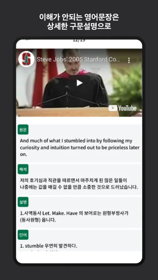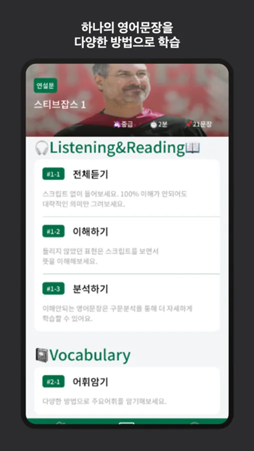 3.하나의 영어문장을 듣기, 이해하기, 분석하기, 어휘암기, 영한통역훈련, 한영통역훈련 총 6가지 단계로 학습하다 보면