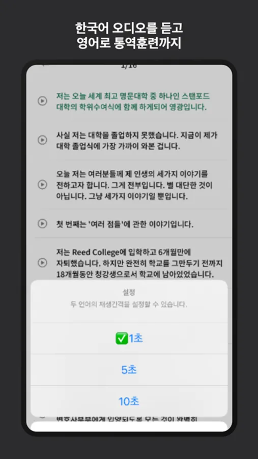 6.영어요정만의 차별화 기능. 한영통역훈련, 영한통역훈련! 한국어 오디오를 듣고 영어로 이야기해보고, 영어 오디오를 듣고 한국어로 따라 말하다 보면