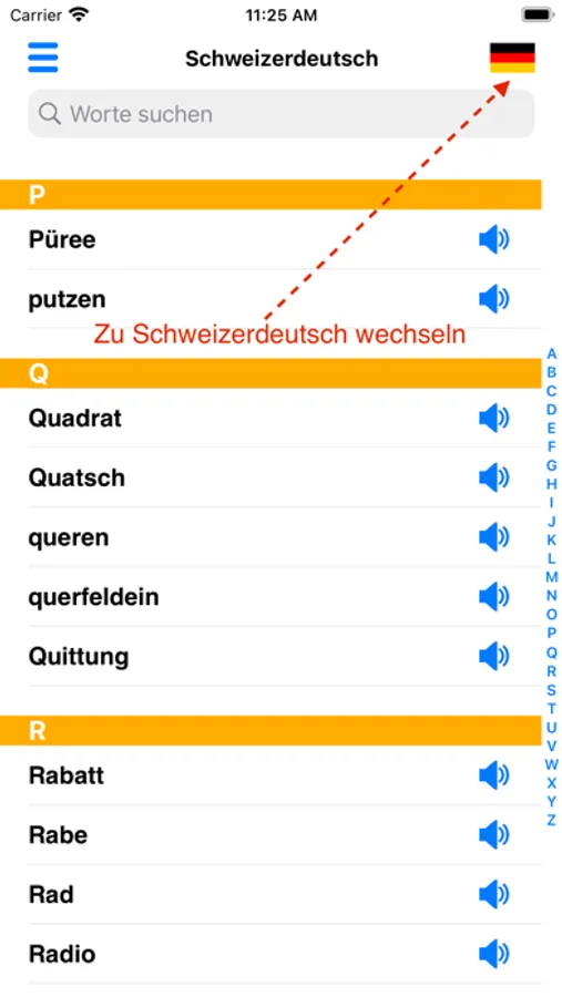 Der schweizerdeutsche Dialekt unterscheidet sich in Aussprache, Wortschatz und teilweise auch in der Grammatik vom hochdeutschen Standard. Deshalb enthält das Schweizerdeutsche Wörterbuch die wichtigsten Vokabeln und zahlreiche Ausdrücke, die nur in der Schweiz verwendet werden. Zu allen Wörtern können Sie hören, wie sie in der Schweiz von einem Muttersprachler ausgesprochen werden. Mit dem Schweizerdeutschen Wörterbuch lernen Sie, die Verben auf Schweizerdeutsch zu konjugieren und den Plural der Substantive richtig zu bilden.