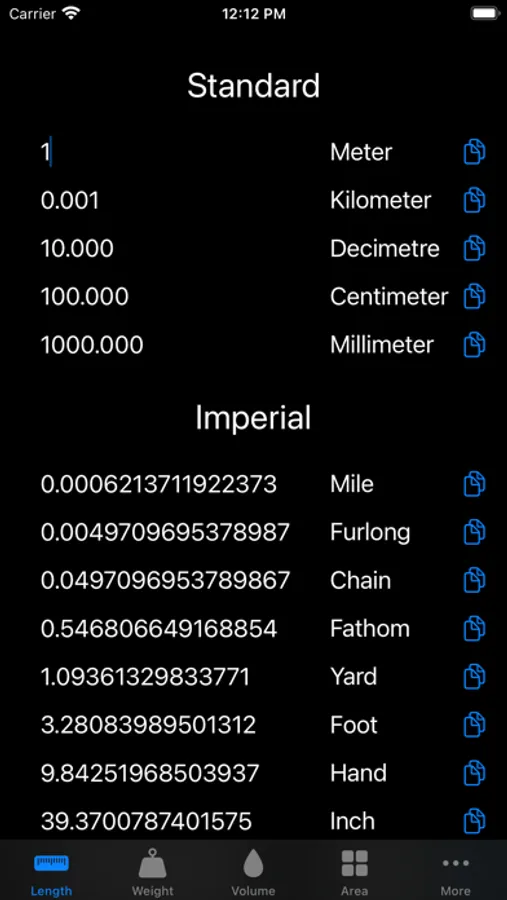 Meter,Kilometer,Decimetre,Centimeter,Millimeter,Mile,Furlong,Chain,Fathom,Yard,Foot,Hand,Inch,Barleycorn,Line