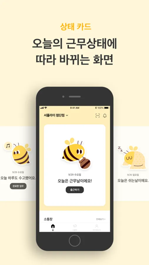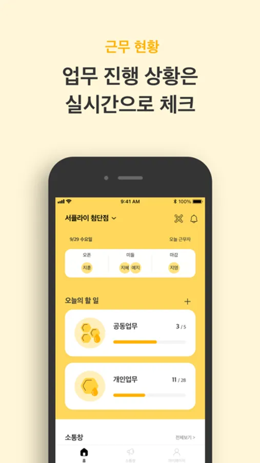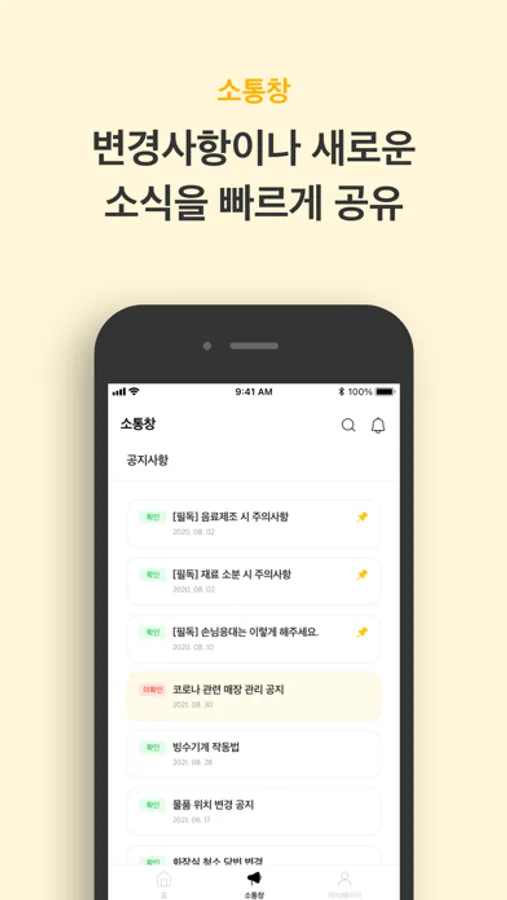 - 매장 관련 공지할 일은 소통창으로 빠르게 전달해요.